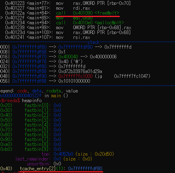 청크를 해제한것과 동일하게 tcache_entry에 해당 값이 저장되어 있는 것을 확인 할 수 있습니다.